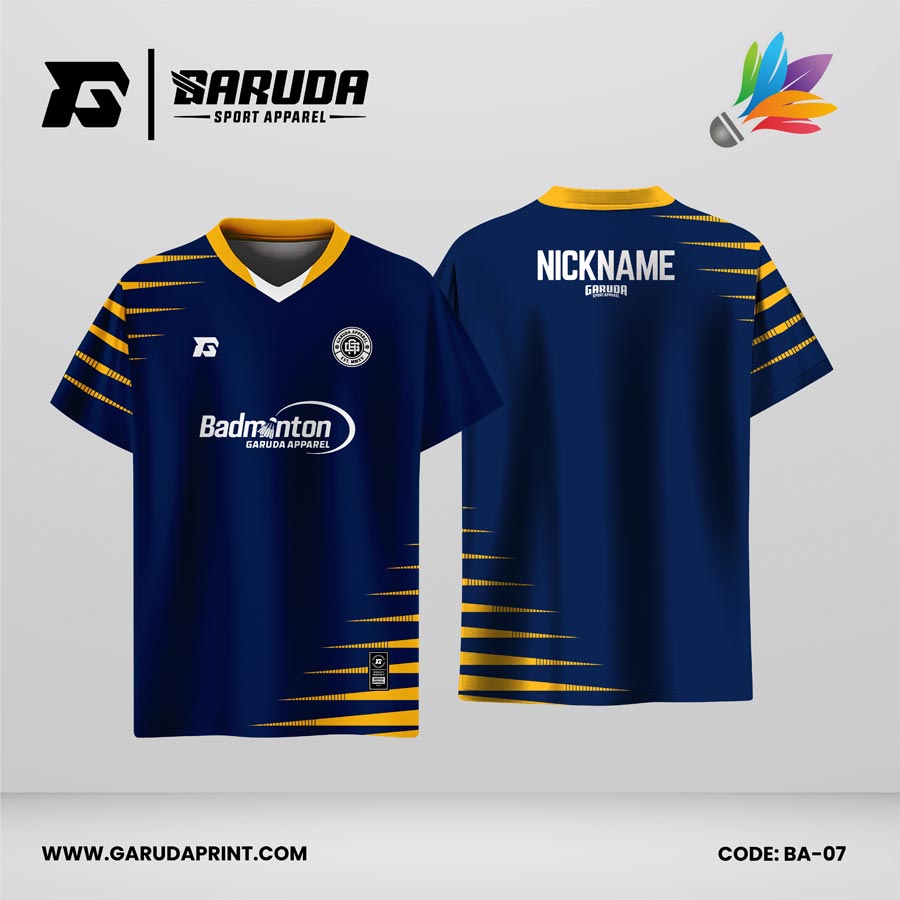 Jersey badminton BA-07 tampil simple tapi berkelas dengan dominasi warna navy/biru tua yang dipadukan aksen kuning pada kerah dan detail garis di sisi. Kombinasi navy–kuning ini memberi kesan tegas, premium, dan profesional, cocok untuk tim atau komunitas bulutangkis yang ingin tampil rapi saat latihan rutin maupun turnamen.