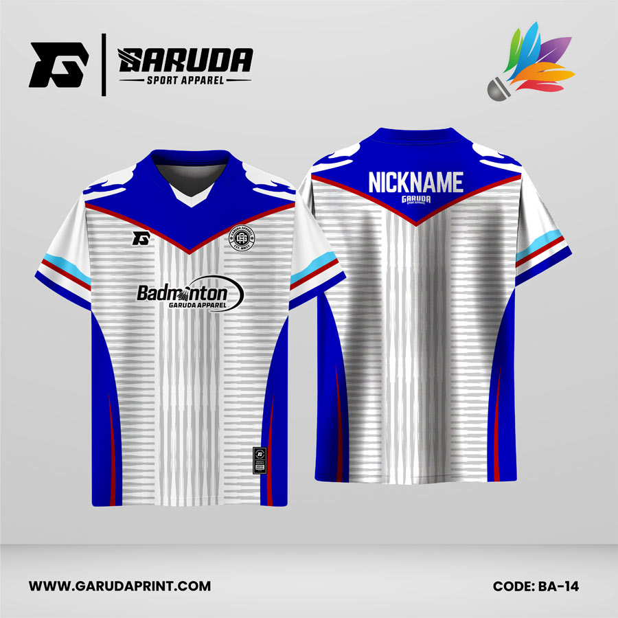BA-14 cocok untuk tim bulutangkis yang suka tampilan rapi dan “tim banget”: putihnya clean, birunya kuat, aksen merahnya tegas, dan garis vertikalnya bikin kesan atletis tanpa terlihat ramai.