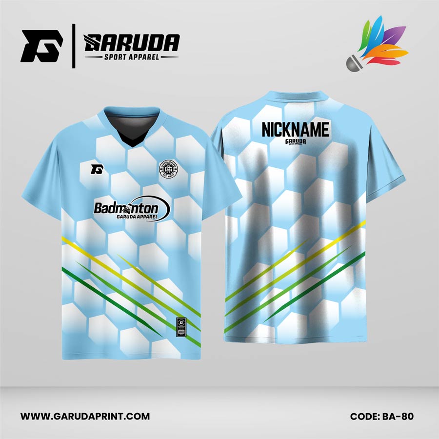 Desain jersey badminton BA-80 punya tampilan yang fresh, ringan, dan tetap terasa sporty. Warna biru langit jadi dasar utama, lalu dipadukan dengan motif hexagon putih serta garis miring hijau–kuning yang bikin kaos badminton ini terlihat bersih dan gampang menarik perhatian saat dipakai di lapangan.