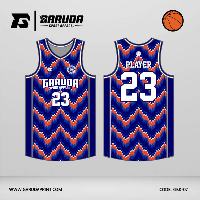 Desain jersey basket GBK-07 memakai warna dasar biru royal yang dipadukan dengan oranye terang dan putih dalam pola zigzag bergerigi yang rapat dan berulang. Motif ini tidak tampil seperti gelombang biasa, tetapi lebih menyerupai ritme zigzag tajam dengan tepi pecah halus yang memberi efek visual cepat, keras, dan penuh tekanan.
