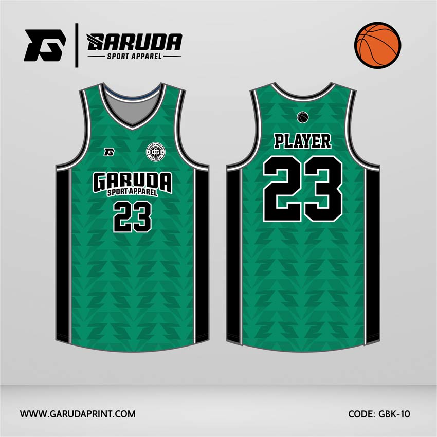 Desain jersey basket GBK-10 mengusung warna hijau emerald yang dalam, dipadukan dengan aksen hitam di sisi dan outline putih pada nomor serta tulisan. Motif utamanya berupa pola geometrik segitiga berulang yang tersusun rapat, menciptakan tekstur visual yang halus tapi tetap berisi.