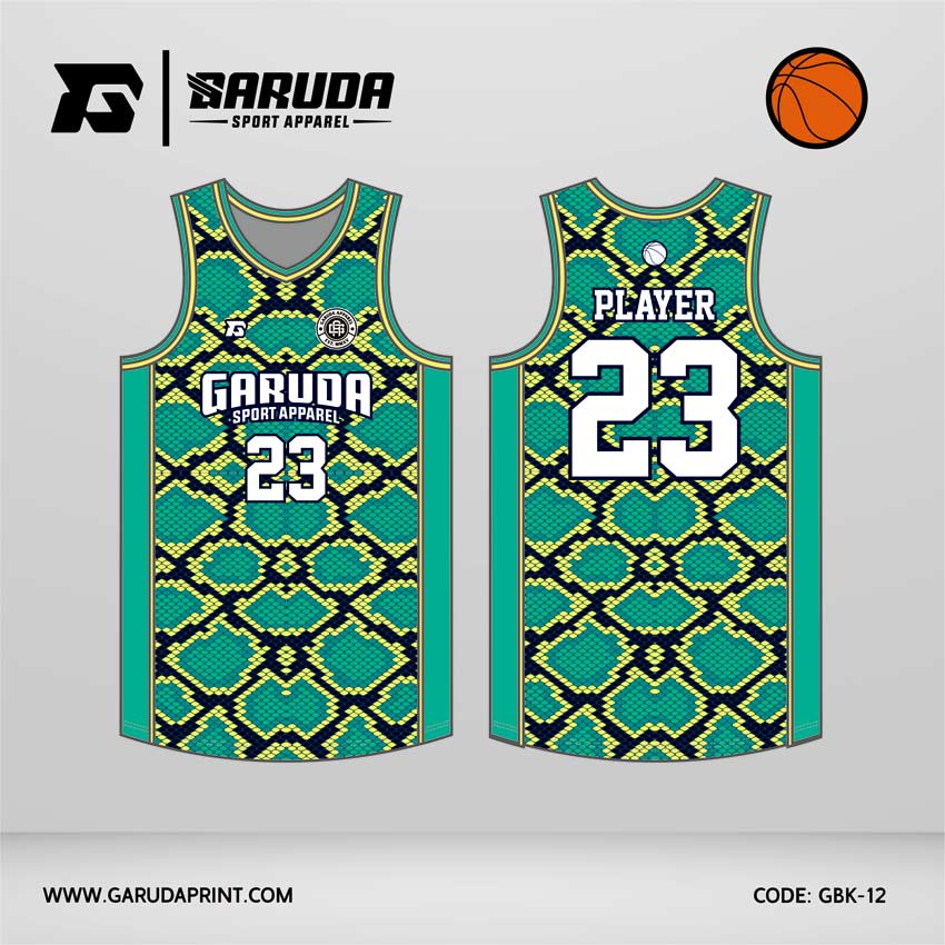Desain jersey basket GBK-12 dari Garuda Print tampil berbeda dengan pendekatan motif yang tidak biasa. Terinspirasi dari pola exotic seperti tekstur kulit reptil, jersey ini menggabungkan warna turquoise green sebagai base dengan aksen lime neon dan garis tegas navy gelap yang membentuk struktur visual berlapis.