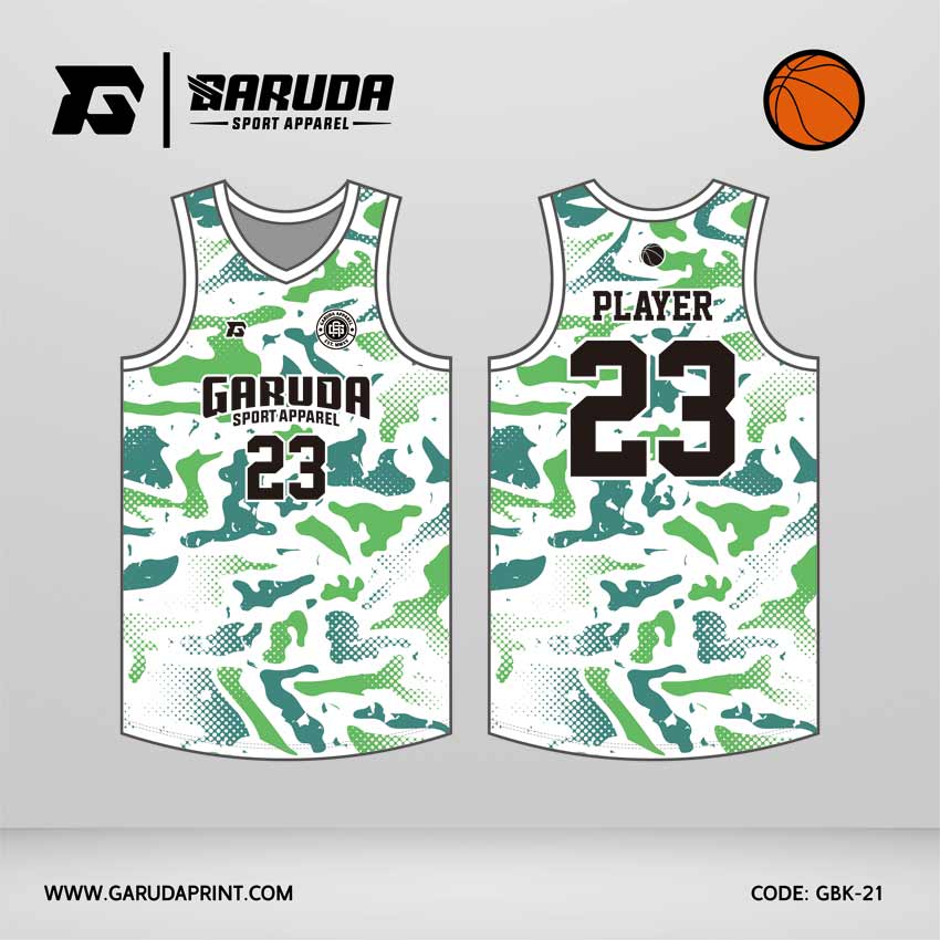Jersey Basket GBK-21 Putih – Hijau dengan Motif Kamuflase Abstrak Bertekstur