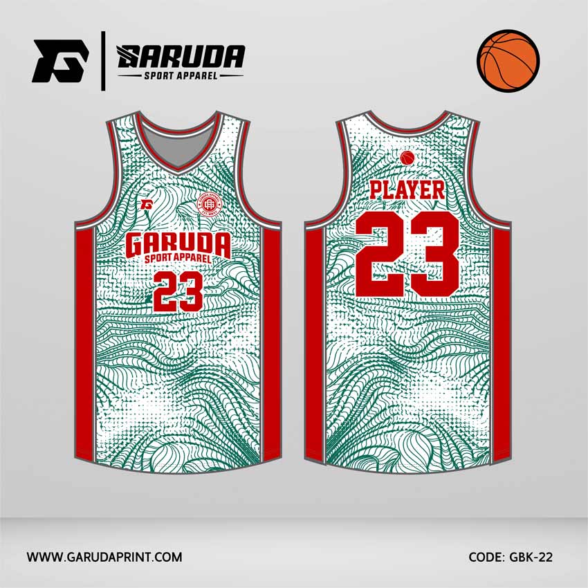 Desain jersey basket GBK-22 dari Garuda Print mengusung kombinasi putih dominan dengan motif garis topografi berwarna hijau yang membentuk alur kontur bergelombang seperti peta ketinggian. Pola ini memberikan kesan teknis, dinamis, dan penuh pergerakan. Ditambah dengan aksen merah pada sisi dan detail nomor, jersey ini terlihat kontras, tegas, dan berkarakter kuat di lapangan.