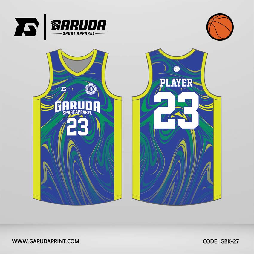 Desain jersey basket GBK-27 dari Garuda Print menggabungkan warna biru kuat dengan kuning terang dalam komposisi visual yang berani dan energik. Motif utamanya berupa gelombang pusaran yang membentuk alur melengkung seperti arus cair yang saling berputar. Pola ini menciptakan efek visual dinamis, seolah permukaan jersey terus bergerak dan berdenyut mengikuti ritme permainan.