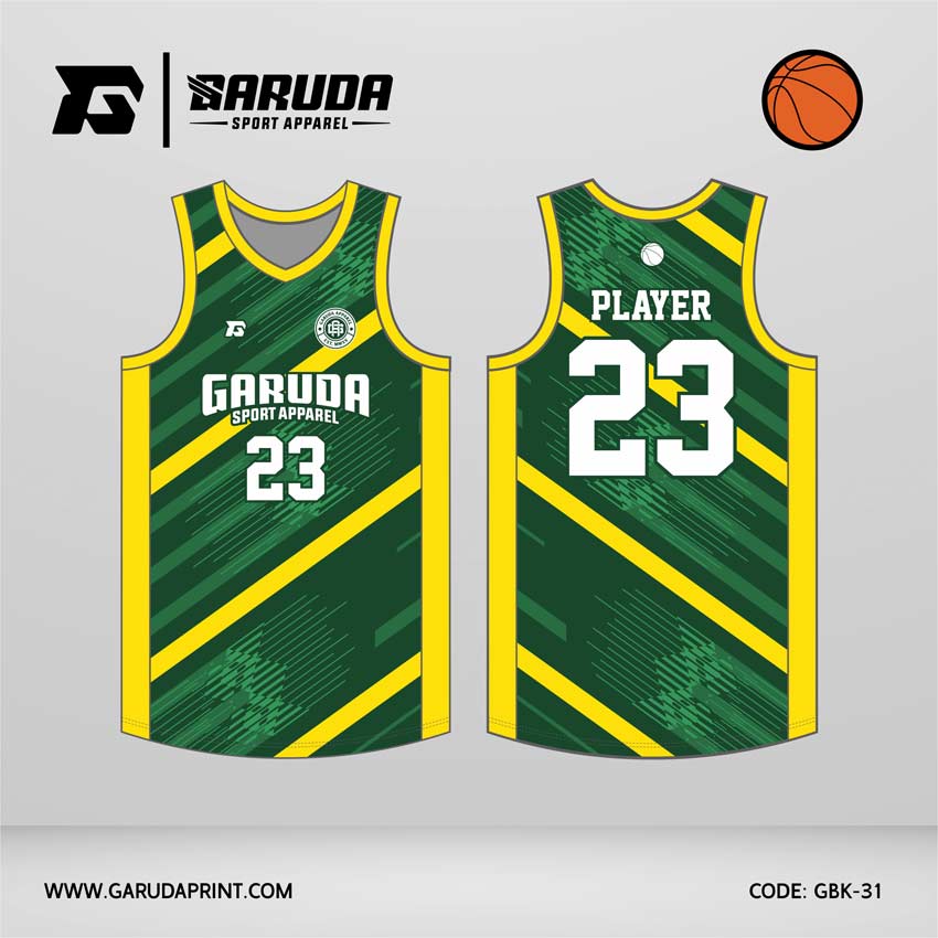 Jersey Basket GBK-31 Hijau – Kuning dengan Motif Garis Diagonal Energi dan Tekstur Brush