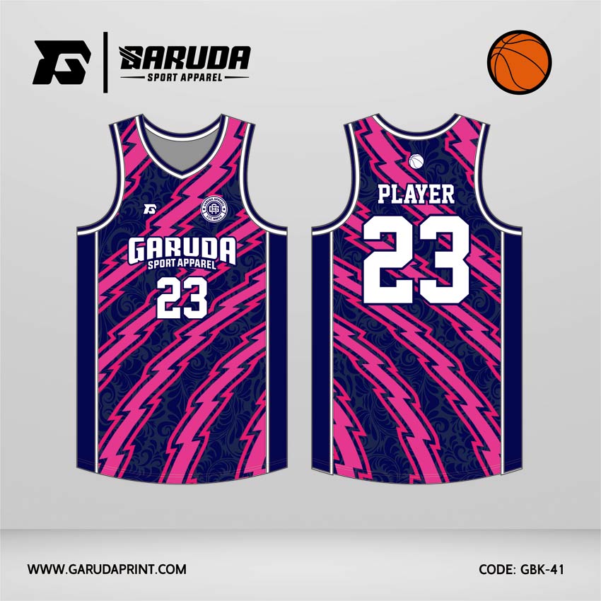 Desain jersey basket GBK-41 dari Garuda Print menghadirkan perpaduan warna biru navy gelap dengan aksen pink terang dalam bentuk motif petir diagonal yang menyilang dari atas ke bawah. Di balik pola petir tersebut, terdapat layer motif ornamen halus yang memberikan tekstur tambahan tanpa mengganggu fokus utama.