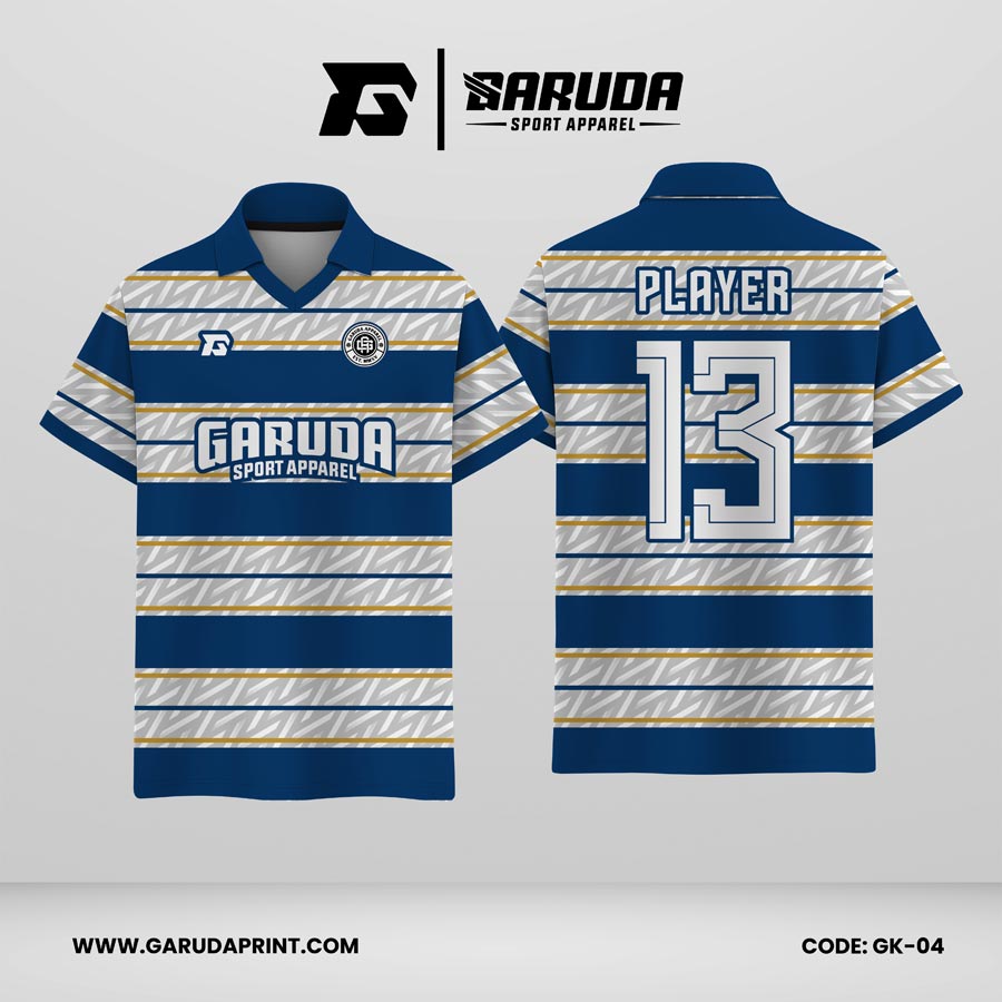 GK-04 cocok untuk tim yang ingin tampil elegan, rapi, dan percaya diri. Perpaduan biru tua, putih, aksen emas, serta motif garis horizontal membuat jersey ini terlihat simpel, bersih, dan tetap berkelas saat digunakan di lapangan.