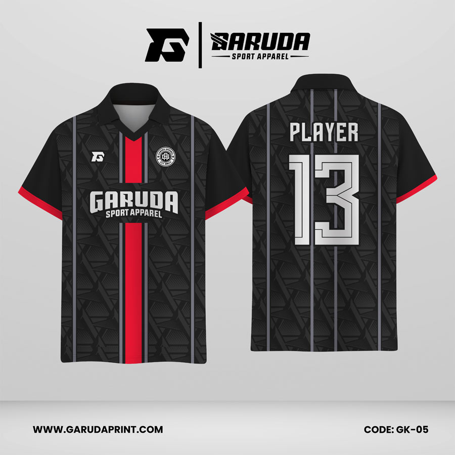GK-05 cocok untuk tim yang ingin tampil tegas, berani, dan kompak. Perpaduan warna hitam, aksen merah tengah, serta motif geometris membuat jersey ini punya karakter kuat saat digunakan di lapangan.