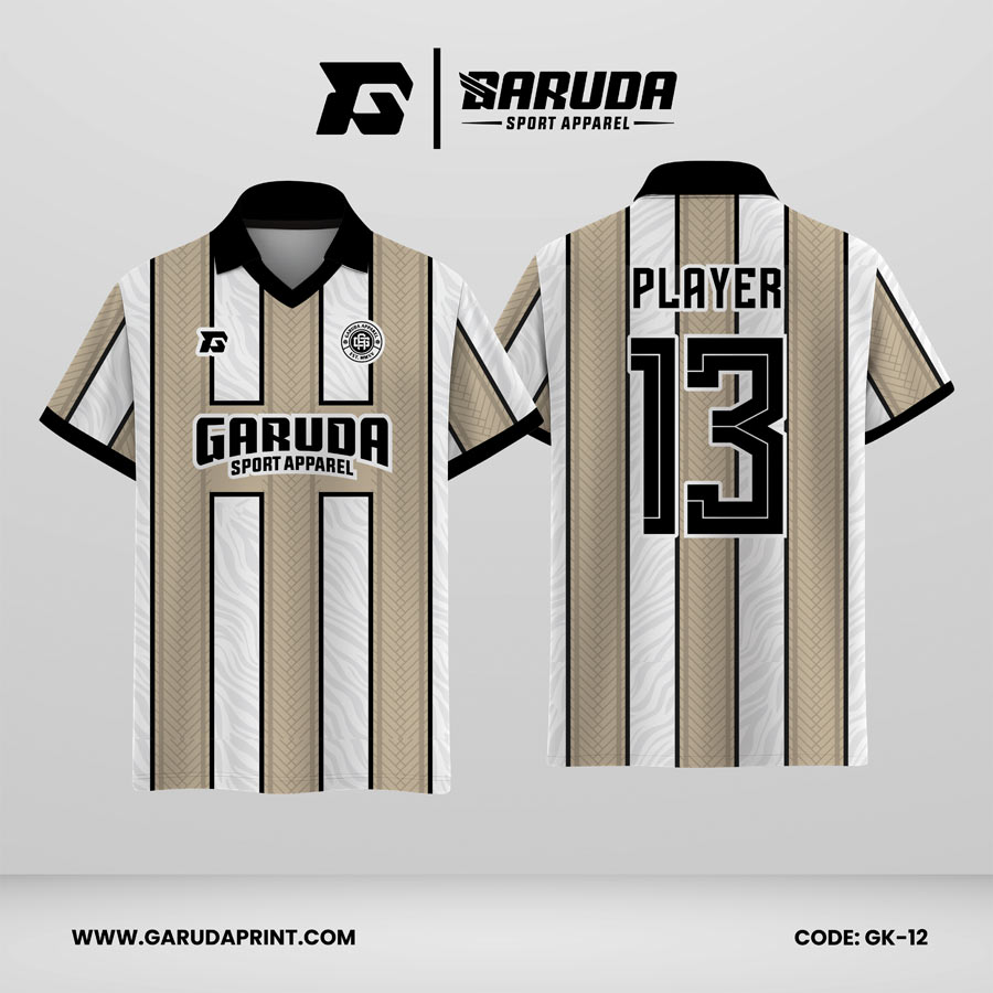 Desain jersey berkerah GK-12 hadir dengan perpaduan warna putih, cream, dan hitam yang terlihat bersih, kalem, dan elegan. Warna putih memberi kesan cerah dan rapi, sementara cream membuat desain terasa lebih hangat dan premium. Aksen hitam pada kerah, garis, dan nomor memberi sentuhan tegas agar tampilan jersey tidak terlihat terlalu polos.