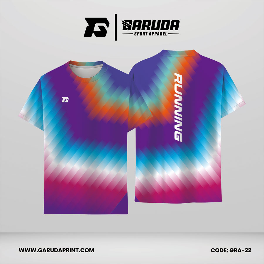 Untuk produksi desain jersey lari printing code GRA-22, Garuda Print menggunakan metode printing sublimasi agar setiap peralihan warna, susunan garis diagonal, dan detail desain dapat tercetak rapi. Teknik ini sangat cocok untuk desain jersey yang mengandalkan permainan gradasi dan lapisan visual halus seperti model ini.