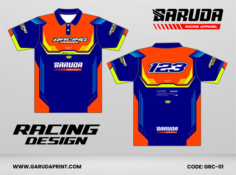 Desain jersey racing GRC-01 tampil tegas, modern, dan penuh energi lewat perpaduan warna oranye, biru tua, dan aksen kuning yang memberi kesan cepat serta agresif di lintasan. Desain ini juga didukung garis tajam, panel geometris, kerah polo, dan area nomor besar di punggung sehingga cocok untuk tim balap, komunitas motor, event otomotif, dan apparel racing custom.