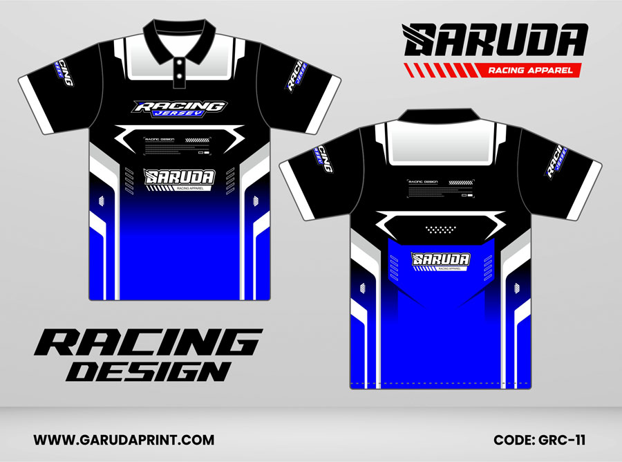 Desain jersey racing GRC-11 dari Garuda Print tampil kuat dengan perpaduan warna hitam di bagian atas, gradasi biru elektrik di badan, serta panel putih di bahu yang membuat tampilannya terlihat bersih dan modern. Komposisi ini memberi kesan cepat, rapi, dan profesional sehingga cocok untuk tim balap, komunitas motor, touring, maupun event otomotif.