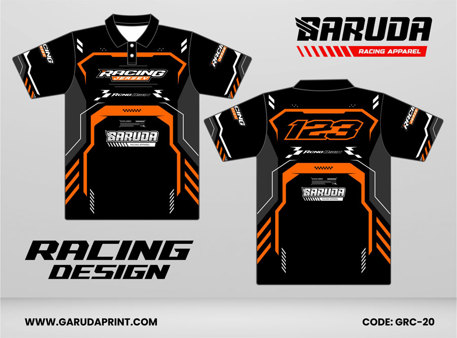 Desain jersey racing GRC-20 dari Garuda Print tampil kuat dengan dominasi warna hitam yang dipadukan aksen oranye terang serta sentuhan abu dan putih di beberapa garis detail. Kombinasi ini menciptakan tampilan yang agresif, tegas, dan sangat cocok untuk tim balap atau komunitas motor yang ingin terlihat solid di lintasan maupun event.