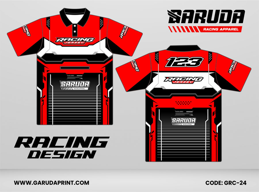 Desain jersey racing GRC-24 dari Garuda Print tampil berani dengan dominasi warna merah inferno yang dipadukan panel putih metalik, hitam pekat, dan detail garis abu gradasi di bagian badan. Susunan motifnya terlihat tegas lewat bentuk panel lebar di dada, aksen sudut tajam di sisi tubuh, serta garis-garis horizontal pada area bawah yang memberi kesan cepat, modern, dan penuh tenaga, sehingga cocok untuk tim balap maupun komunitas motor yang ingin tampil mencolok.