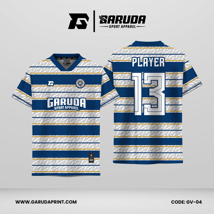 Desain jersey retro GV-04 dari Garuda Print tampil clean dengan kombinasi warna biru navy dan putih dalam pola stripe horizontal yang rapi. Motifnya diperkuat dengan pattern halus di bagian putih serta aksen garis tipis berwarna gold yang memberi sentuhan elegan tanpa terlihat berlebihan.