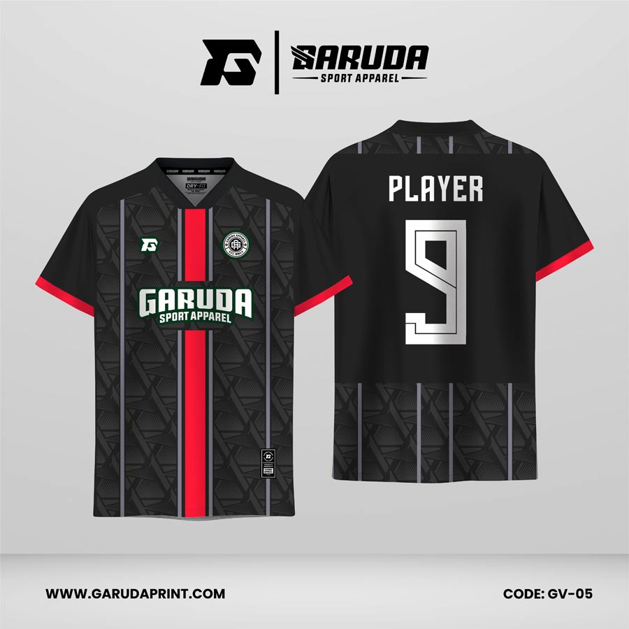 Desain jersey retro GV-05 dari Garuda Print tampil dominan dengan warna hitam carbon yang dipadukan aksen stripe vertikal merah di bagian tengah. Motifnya diperkuat pattern geometris gelap yang menyatu dengan warna dasar, sehingga menciptakan kesan retro yang modern, solid, dan berkarakter kuat.