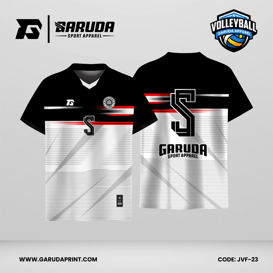 Jersey Voli JVF-23, Kombinasi Hitam–Putih dengan Aksen Merah dan Motif Line Minimalis yang Modern